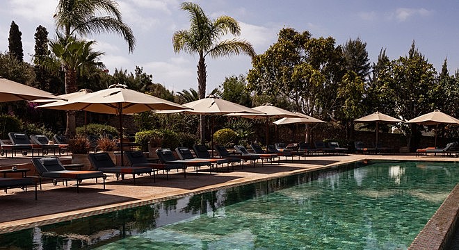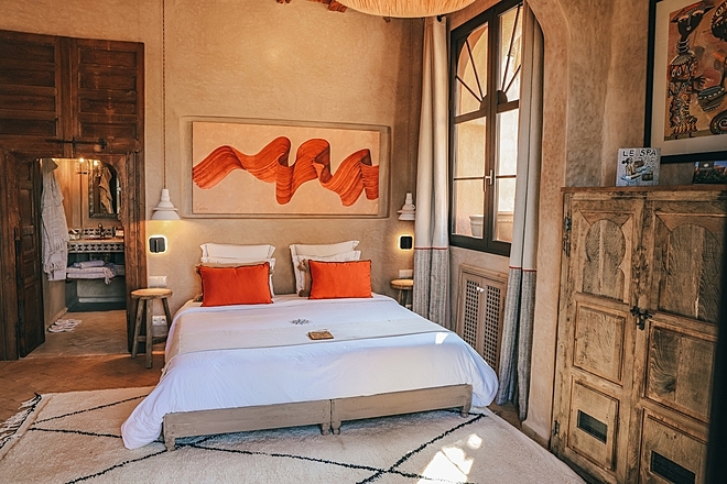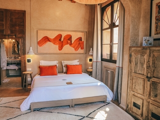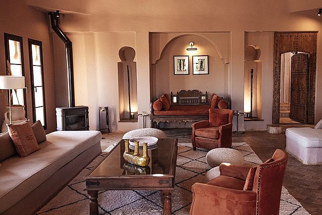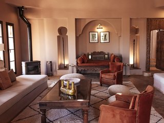 The bedrooms are all spacious with air-conditioning and safes. The walls are finished in deep earthy tones and the bathrooms are traditional tadelakt and include mini hammam kits. Luxury rooms have fireplaces and deep baths (other rooms just have showers). Our favourite family rooms are the Douarias, 2 bedroom bungalows set in the grounds.
