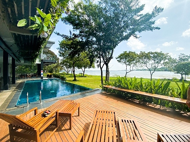 Leisure facilities include a swimming pool, outdoor seating areas, and garden spaces ideal for relaxation or enjoying the serene lake views.