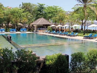 Jimbaran Puri is a luxury resort set directly on the beach in Jimbaran Bay, Bali, offering both cottages and villas in a traditional Balinese design under the Belmond brand.