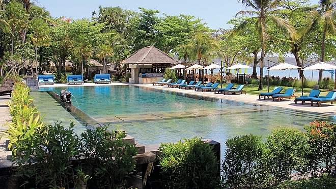 Leisure facilities include a large free‑form infinity‑edge swimming pool, beach access, a spa by the sea, and cultural experiences such as Balinese cooking classes and sunset cruises.