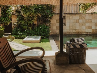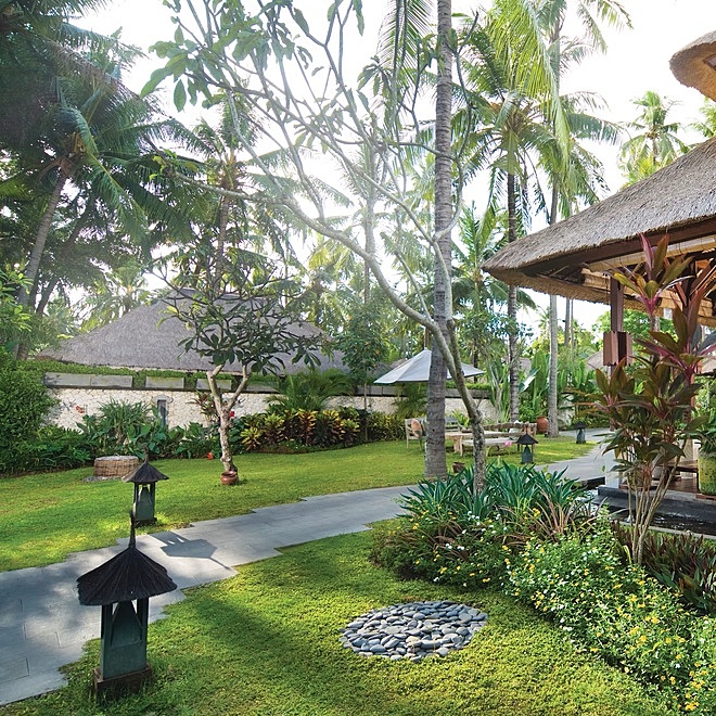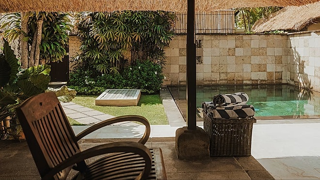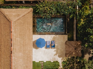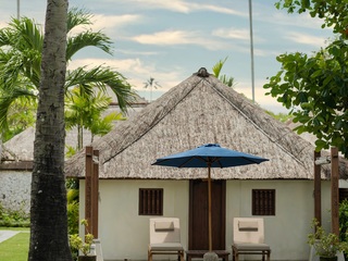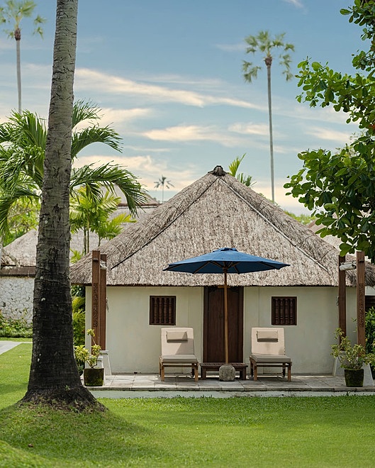 Rooms are a mix of garden cottages, beachfront cottages, pool villas and deluxe pool villas, some with one or two bedrooms. Interiors include marble or timber floors, high ceilings, rain showers, sunken bathtubs, and private terraces or gardens.