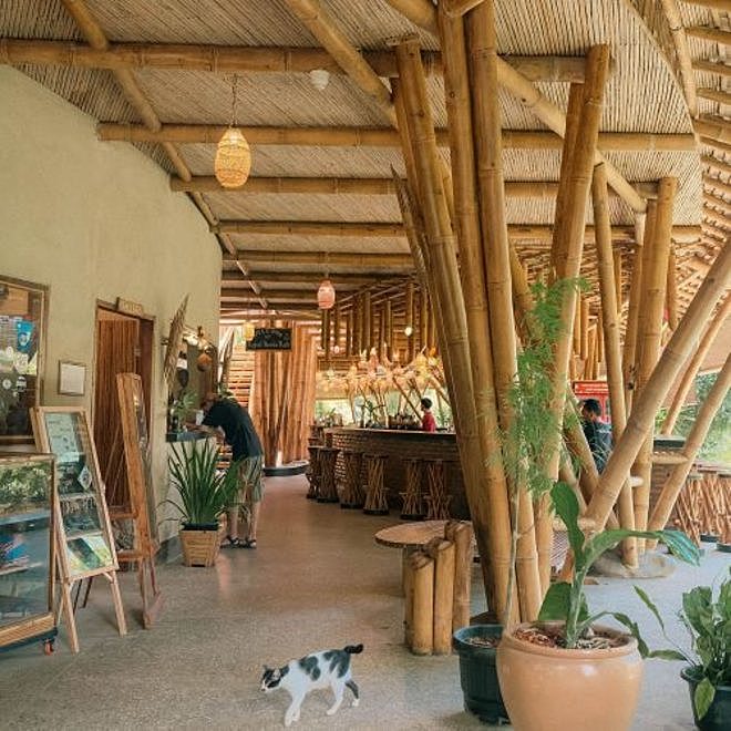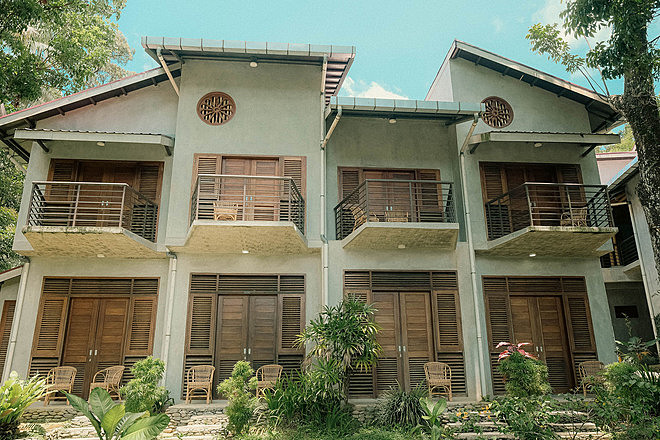 Rooms are modest wooden or bamboo cottages, about 38 in total, many with verandas, mosquito nets, fans, en‑suite (often open‑air) bathrooms, and views over rainforest or river.
