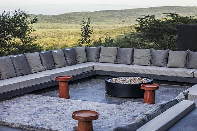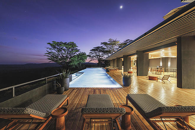 Leisure facilities include a large infinity swimming pool overlooking the savannah, a spa treatment room, and multiple lounge and dining spaces. Evenings are typically spent around the fire pit or in the main bar and restaurant after game drives.