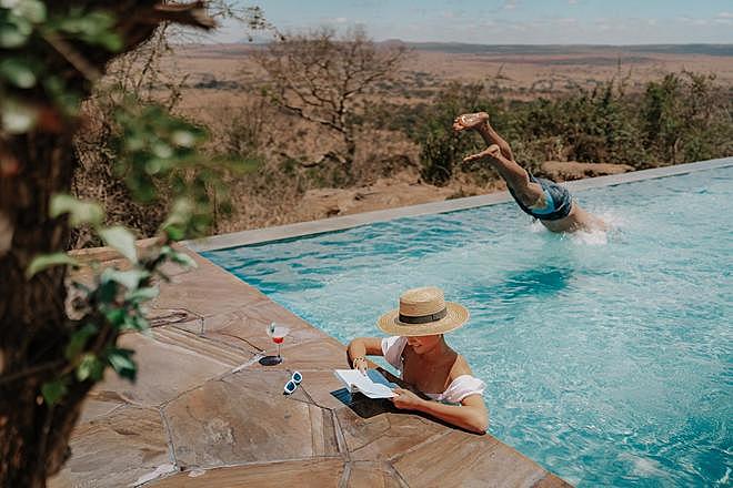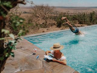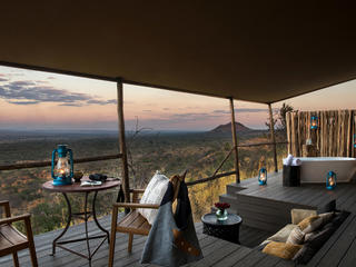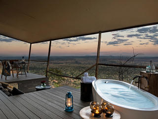 The lodge sits on an escarpment overlooking the Tarangire River valley. It offers 15 tented suites with private decks and outdoor bathtubs. The elevated main lodge has a large lounge and bar, indoor and outdoor dining areas, a spa and swimming pool.