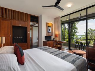 Rooms are spacious, contemporary, and designed with natural materials, most featuring private balconies with panoramic lake or jungle views.